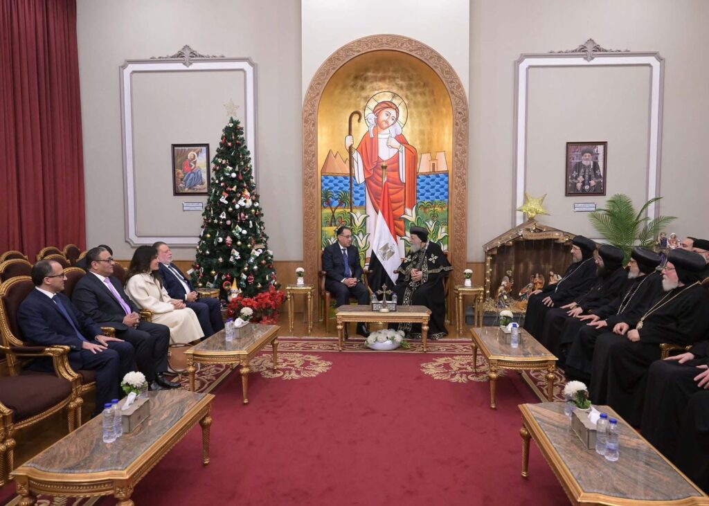 قدم الدكتور مصطفى مدبولي، رئيس مجلس الوزراء، التهنئة لقداسة البابا تواضروس الثاني، بابا الإسكندرية وبطريرك الكرازة المرقسية؛ بمناسبة الاحتفال بعيد الميلاد المجيد، وذلك خلال زيارة له لمقر الكاتدرائية المرقسية بالعباسية، بحضور السيد/ حسن عبد الله، محافظ البنك المركزي.